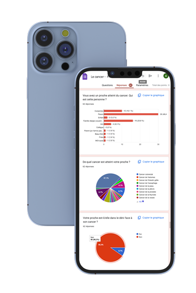 - Questionnaires : 62 participants de divers profils (tranche d’âge, statut familial, vécu avec le cancer).